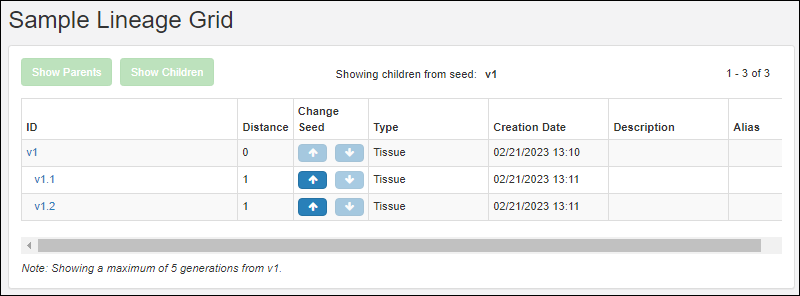 The lineage grid can be especially helpful when viewing lengthy lineages or derivation histories. By default, the children of the currently selected sample, aka the "seed", are shown.