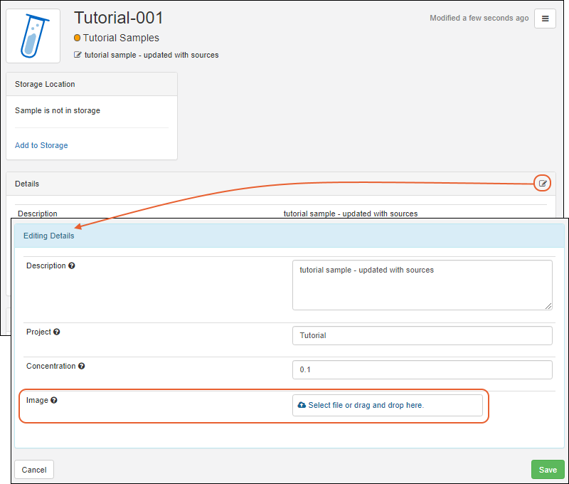Details for any sample in the system, you will be able to upload a file by either clicking in the selection window or dragging and dropping from your desktop. Click the sample name on any grid to open the Overview tab. When you are editing sample details, you can click to select or drag and drop a file to upload it.