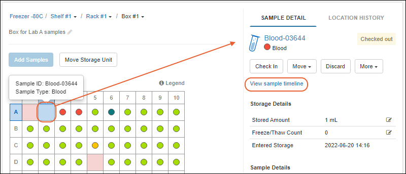 - If you select a position where a sample is checked out, shaded pink, you will see details about the sample that "belongs" in that position but is currently checked out, including a link to View sample timeline where you can learn more about who checked it out, when, and why.