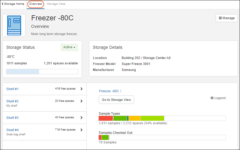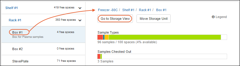 - Visual bars follow, summarizing the contents of this storage unit. They are colored using the label colors assigned to Sample Types.