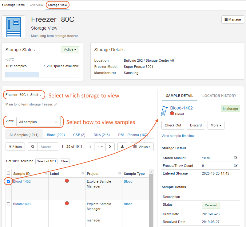 All storage units, from the overall storage system to a shelf to a plate or bag, show information about Samples in a grid in the Storage View, as shown above. Scroll to the right to see additional columns.