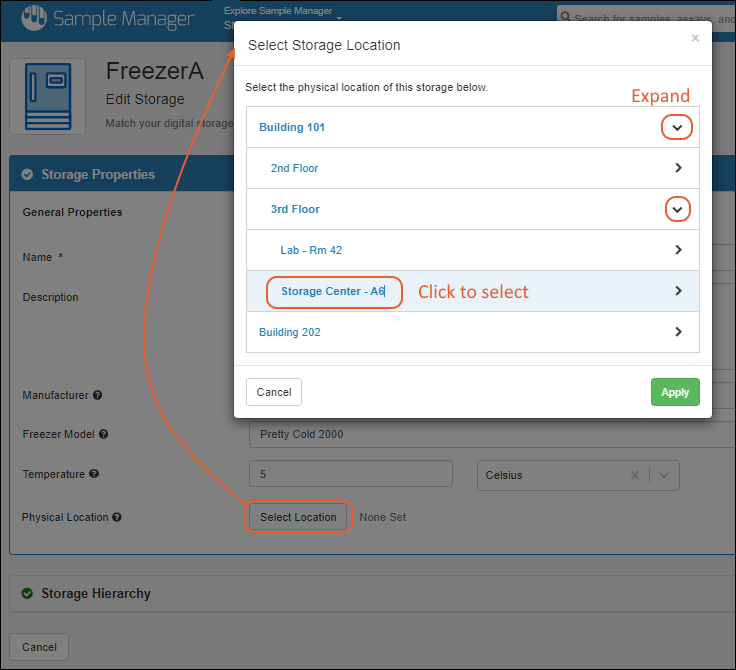 You could keep track of locations of your storage by using the "Description" field in the Storage Definition, but those details are only available in some areas. By contacting LabKey, we can configure your physical location hierarchy within the application for you, so that you can set the