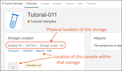 When viewing storage details for a sample, you will see both the physical location of the storage it is in (in gray), and the storage location for that sample within that storage system (in blue). You can click the blue locations within the storage for a grid of all samples stored with the one you are viewing.