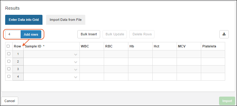 Enter values directly into the grid. Any columns that are required, including the sample mapping field (SampleID), will be marked with an asterisk (*). Before you can import the data, these columns will need a valid value in every row.
