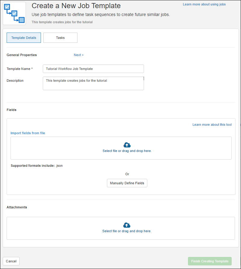 Attachments section, upload any files that should be available to any jobs created from this template.