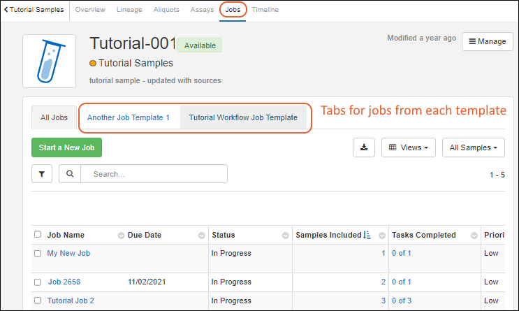 Jobs tab for a source or sample, it will include a tabbed grid of all jobs for that entity, showing all jobs on the first tab, plus an additional tab for jobs from each specific template used (by name). These template-specific job grids show the custom fields for that template with values for the sample you are viewing.
