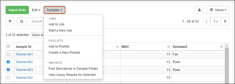 From a grid of samples, including tabbed grids showing multiple sample types like picklists, you can select desired samples, then choose