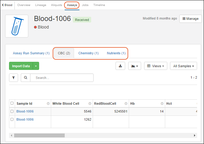 On assay-specific tabs, you can see all the assay results for your selected group of samples.