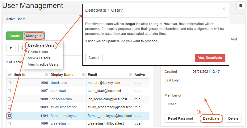 Deactivated users may no longer log in, but their display name and group membership information will be retained for display and audit purposes. If the user is reactivated at a later time, this information will be restored. Deactivation is the recommended action for former employees, for example.