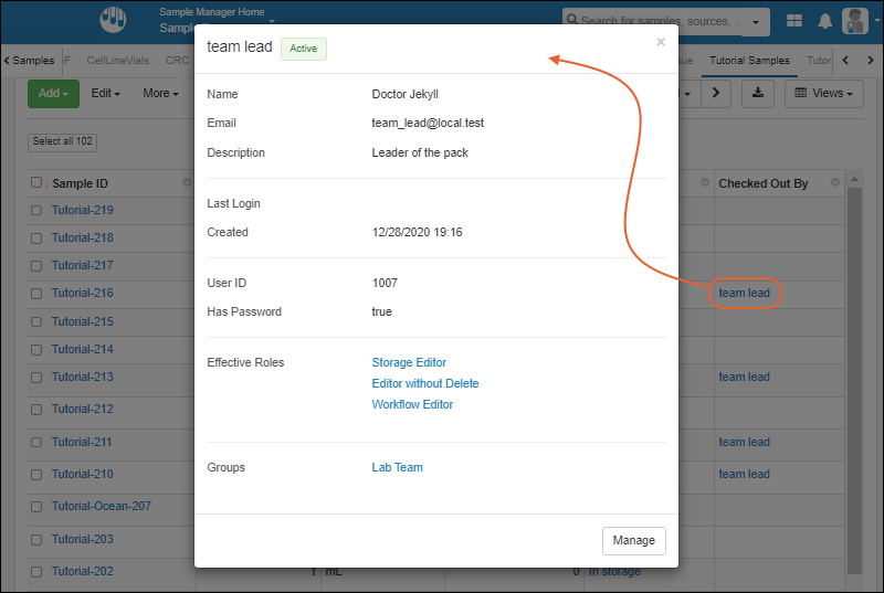 Within the application, when an administrator (or user with the "See User and Group Details") clicks a username, such as in a sample grid or ELN, they will see a popup showing the full name, email, description, as well as effective roles and groups this user is a member of.