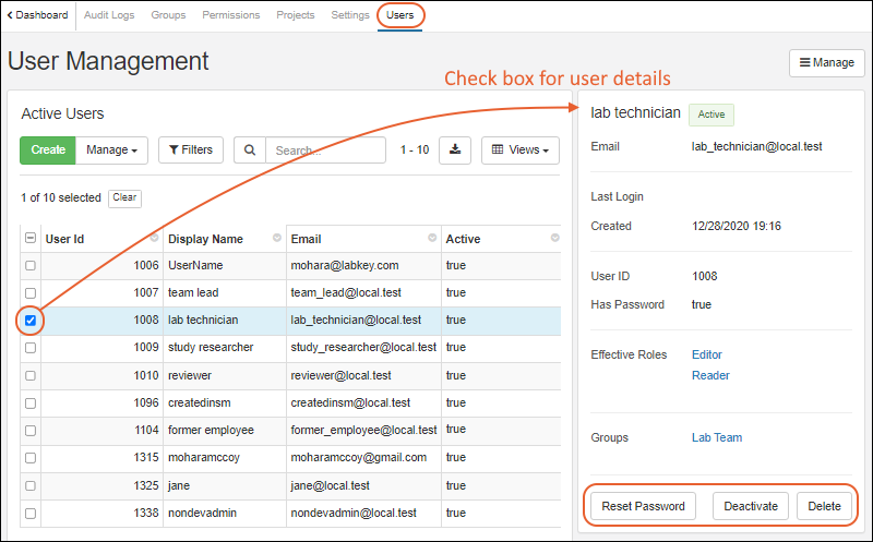 - Check the box to select a single user you want to deactivate. Click Deactivate in the User Details panel on the right.