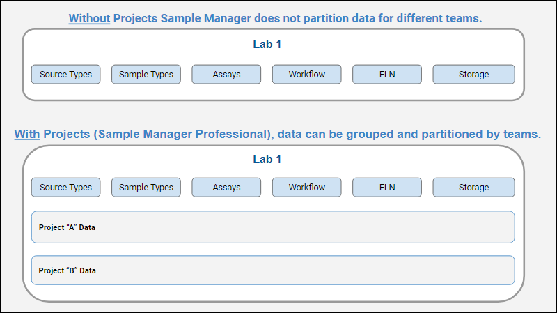 Without the use of Project organization, Sample Manager does not partition data for different teams. Permissions are granted to all data simultaneously in a single "container".When you enable Projects in the Professional Edition of Sample Manager, data can be grouped and partitioned by teams.