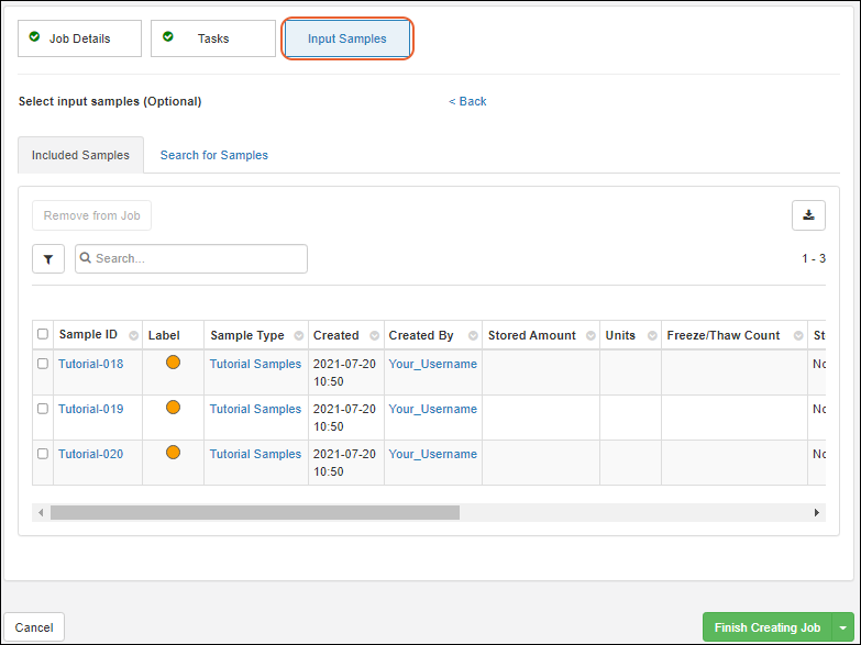 - Review the listed set of included samples; if necessary select one or more rows and click Remove from Job to remove them.