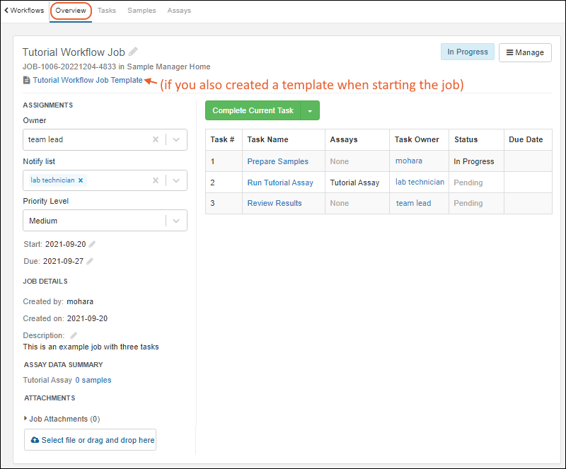 Workflow jobs organize related tasks into a sequence of work to be completed. A set of samples to be worked on can be associated with the job, and it can include direct links to upload data for the necessary assay tests performed on those samples. You can start by selecting samples directly from a grid, or use a