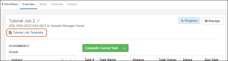 Jobs that were created from templates show the template name on the Overview tab of the job details. Click the job name to open the job details, then click the template name to open the template itself.