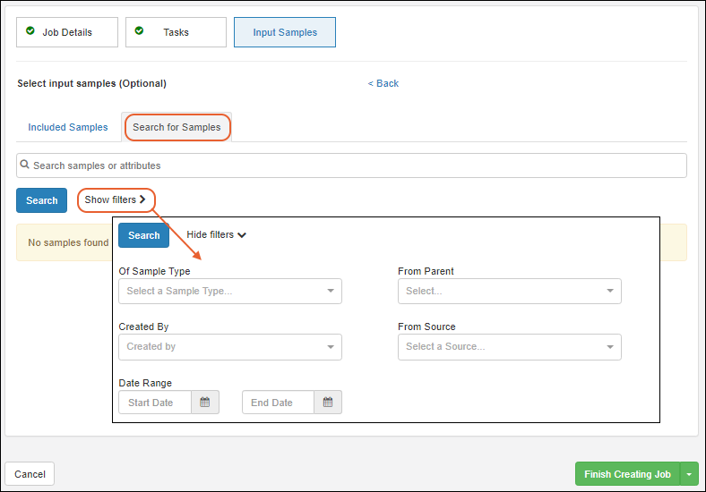 - If you did not start creating this job from a selection of samples, when you open the Input Samples panel, click the Search for Samples tab (if it is not open by default).