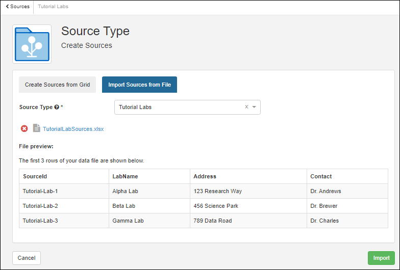 - Click Import to import the file and create these sources.