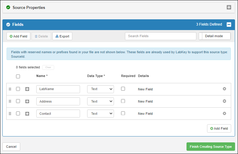 - Notice the blue banner informing you that your file contained fields with reserved names which are not shown. This refers to the "SourceId" field that is present in the data file and cannot be "defined" again, though you will be able to populate it in the next step..