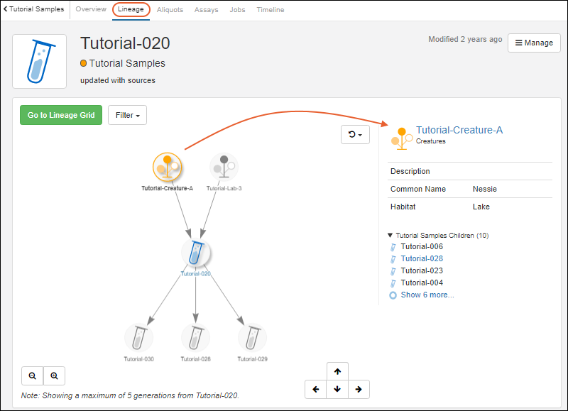 Lineage tab. You'll see a graphical representation of the creature and lab sources for this sample, as well as child samples 'derived' from it.