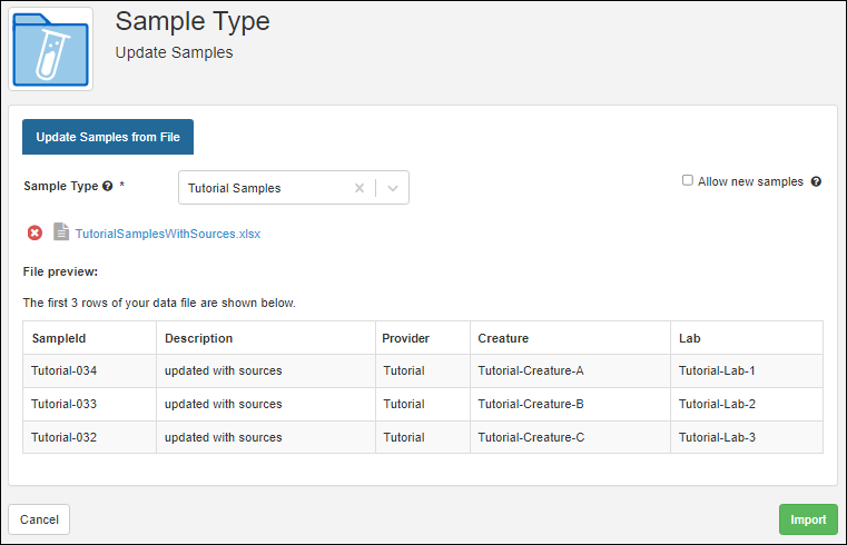 - Note that if our spreadsheet included both existing samples to update and new samples to create, you'd need to check the box to Allow new samples but for this tutorial, leave it unchecked.