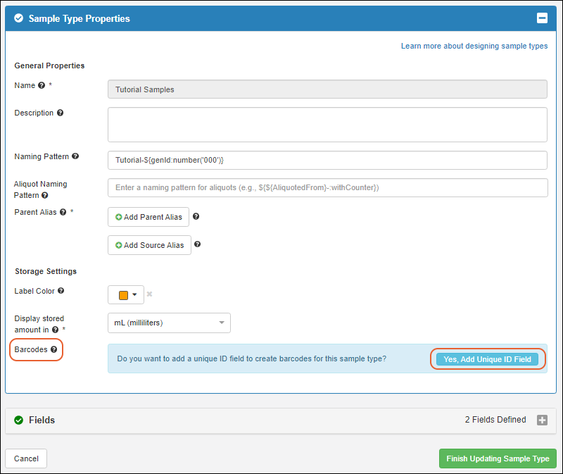 Click Finish Updating Sample Type. Barcodes will be automatically generated for any existing samples of this type, as described in the next section.