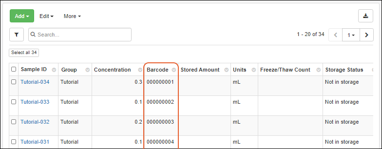 Users can locate samples using the barcode values in this column, but must manage uniqueness and generate new barcode values for new samples outside of the application.