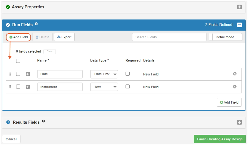 You could also manually add results fields, which will be different for each row of data within a given run, but in this tutorial, we will infer them from an example spreadsheet.