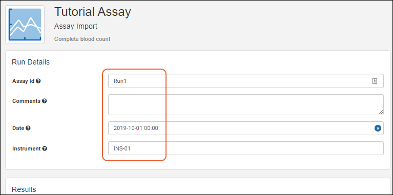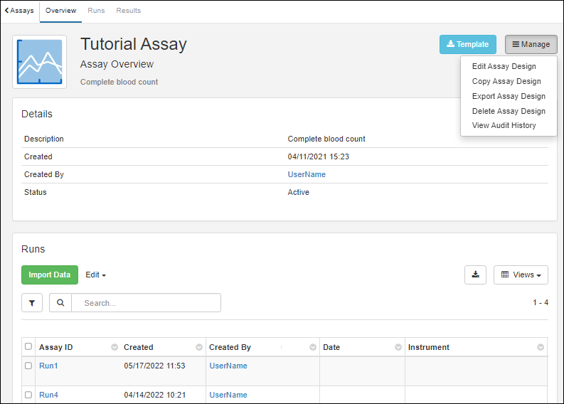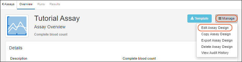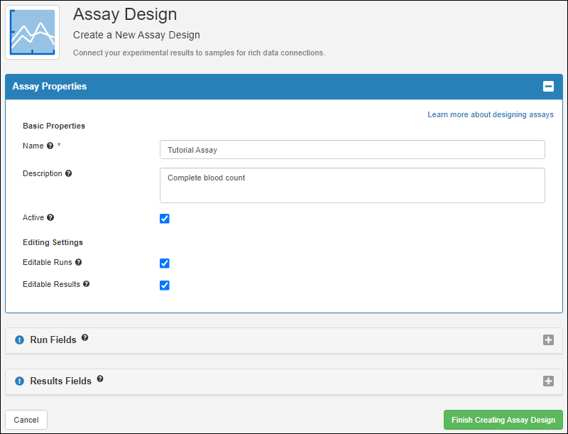 Assay Designs describe the structure of assay data you will gather for your samples. Similar to sample types, you define the properties and fields of your experiment data. Assay data will also be mapped to the sample that it is about. In this topic, we define a "Tutorial Assay" and import an example run of data for the "Tutorial Samples" we created in the previous step.
