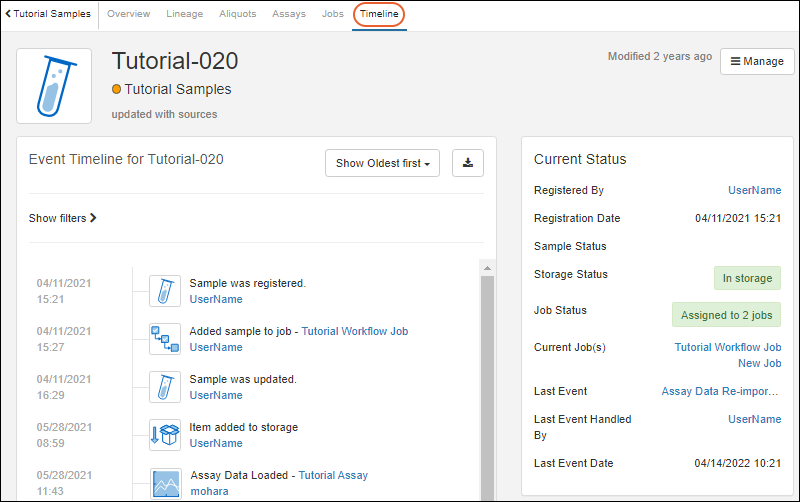 Timeline: a history of events for this sample (so far only registration has occurred)