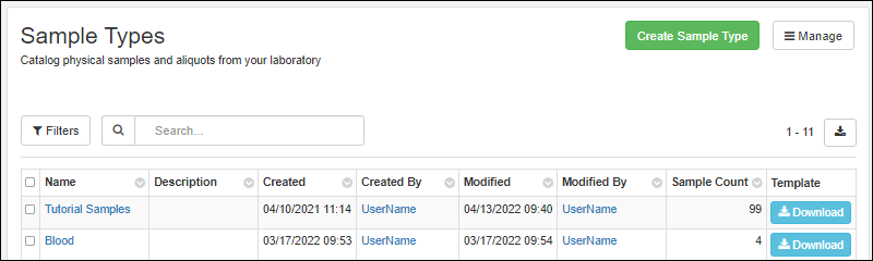 Sample Types help you organize samples in your lab and allow you to add fields that help you describe attributes of those samples for easy tracking of data. Each individual Sample has a unique ID and is a member of one Sample Type. This topic assumes you are starting from an "empty" application and walks you through creating a "Tutorial Samples" type and populating it with a set of samples to use in the next steps.