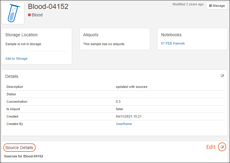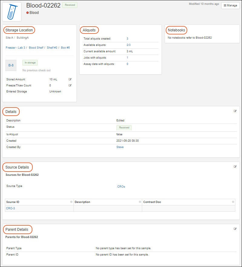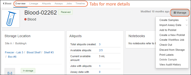 Overview: basic details including the values of all sample properties and fields as well as the storage location (if any)