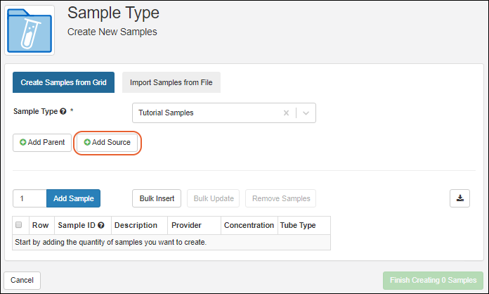 Once you have defined the Sample Type for your samples, you can import them by typing directly into a grid, bulk entering values, or by importing a spreadsheet of sample information, as used in this tutorial.
