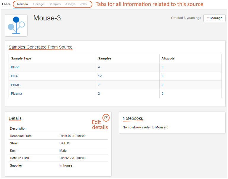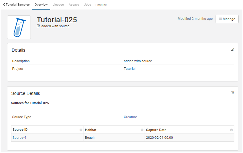 Lineage: parentage and source information (Tutorial-018 has both parent and child sample linkages provided in our example file)