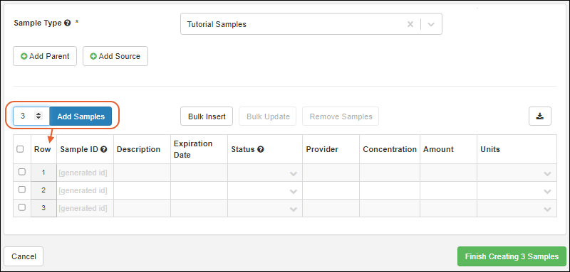 To directly create samples in a grid, start by adding a blank row for each samples you want to create. Enter the number of samples and click Add Samples.