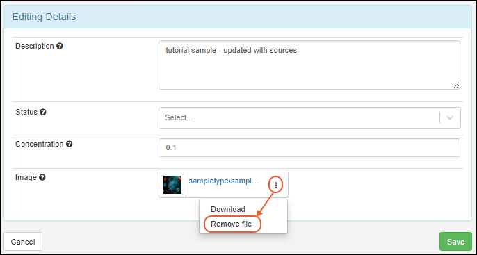 Details for any sample in the system, you will be able to upload a file by either clicking in the selection window or dragging and dropping from your desktop. Click the sample name on any grid to open the Overview tab. When you are editing sample details, you can click to select or drag and drop a file to upload it.