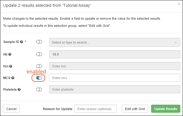 An editing popup will let you select which field or fields you want to batch update. By default, all fields are disabled; enabling a field using the toggle will let you enter a value to assign for that field in all rows. Shown here, the MCV field will be updated with a shared value, but all other fields left unchanged.