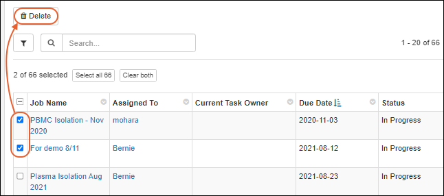 To delete one or more jobs, use the checkboxes on the