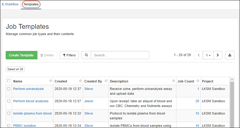 Manage > Job Templates from the workflow dashboard: