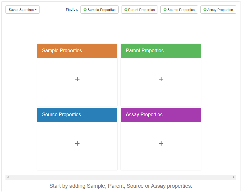 Sample Properties: Find Samples based on properties defined in the Sample Type, whether built-in (common to all Sample Types) or user-defined. You can either narrow to a specific type or search across common properties of all Sample Types.