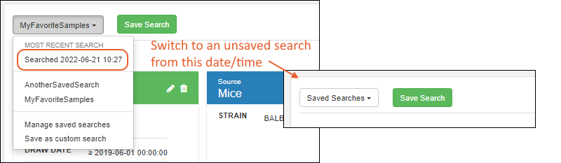 Switching to a previous search result (such as "Searched 2022-06-21 10:27" in the above) will add a Save Search button to the header.If you make changes to an existing saved search, you'll be able to use the Save Search button as usual, or select the dropdown and Save as... a new named search.