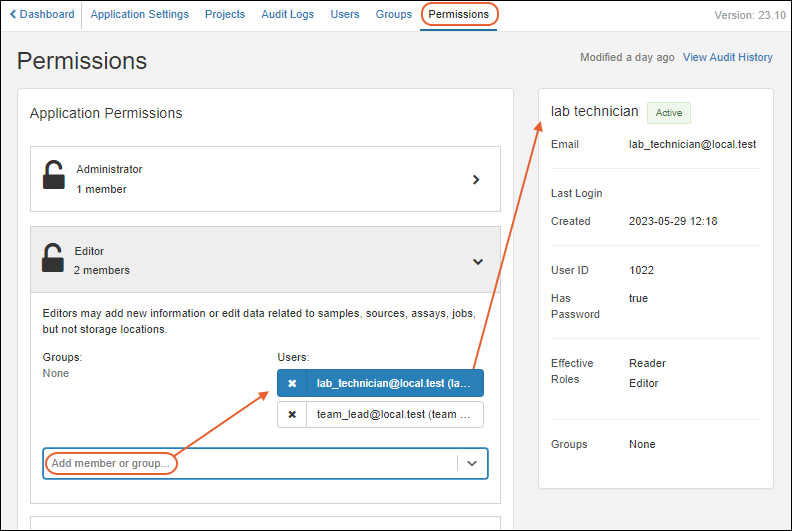 - In the image below, the Editor role is being granted to the team lead and lab technician; all three fake users we added are still also members of the Reader role.