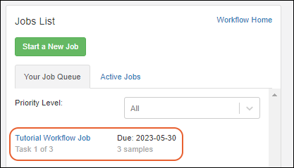 - To return to the job details page, you can click the bolded word "here" in the green "Successfully created assay run" banner. For this tutorial, navigate as follows to see how task assignment changes your task queue.