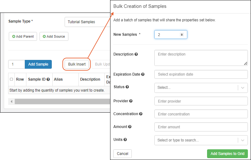 Bulk Insert, you will have an additional selection to make in the bulk creation popup. Choose whether you want to use the parent sample(s) to create: