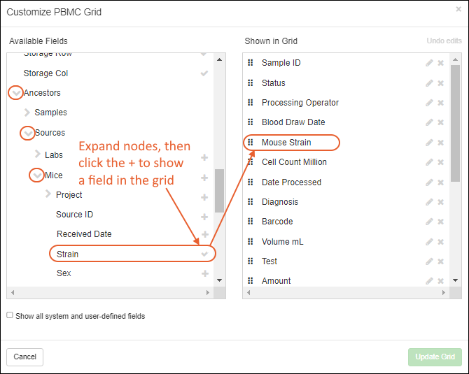 For example, if you had a "PBMC" sample type and wanted to include in the grid both the "Draw Date" field from the parent "Blood" sample type AND the "Strain" field from a "Mouse" source, you would add the following: