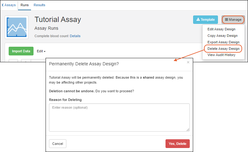 • Note that when you delete a design, all runs of data associated with it will also be deleted. Deletion cannot be undone.