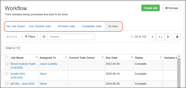 The All Jobs tab shows the full list of jobs. Other tabs provide subsets.