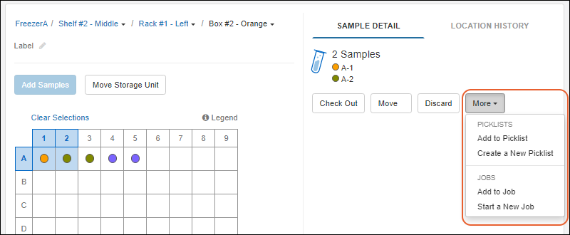 To simplify storage workflows, you can also select samples in storage views and create new picklists and workflow jobs including them, or add them to existing picklists and jobs. You can use the tabs for the specific Sample Type, where you'll use the usual sample grid menus. Or from the "All Samples" tab or a storage grid view, select samples and choose the desired action from the Picklists or Jobs menu. Note that on narrower browsers, these buttons will be combined into a More menu.