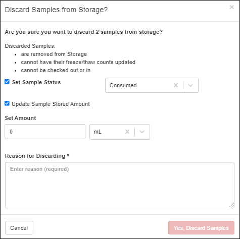 When you discard a Sample via any of the methods described here, you have the option to update the status and amount of the sample.You can discard one or more Samples from Storage in many places throughout the application, including:
