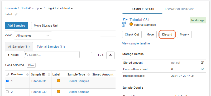 After discard, the Storage panel for a Sample will still show the amount set for the sample, and the time of discard, but will not retain the freeze/thaw count.