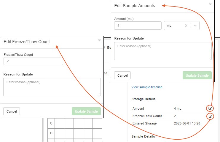 When a sample is initially added to storage, an initial freeze/thaw count can be provided (for temperature-controlled storage). The storage amount can be provided when the sample is first created or at any other time. If you need to edit these settings later, you can do so by clicking the sample, and clicking either icon in the Storage Details section to open an edit panel.Update the information in the popup, enter a Reason for Updateif required or desired, then click Update Sample to save your change. The reason will be retained in the audit log and timeline for the sample.